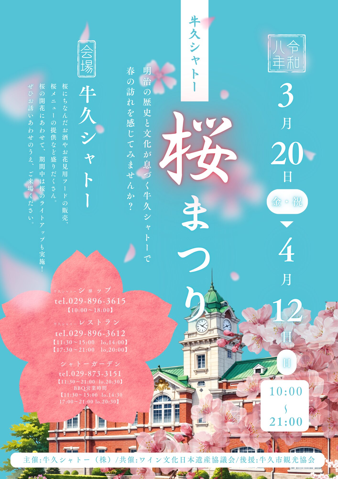 2026年 牛久シャトー桜まつり 2026年3月15日 最終更新日時 : 2026年3月15日 tkmiyakoji2002 3月20日~4月12日 牛久シャトー桜まつり 明治の歴史と文化が息づく牛久シャトーで春の訪れを感じてみませんか? 桜の開花にあわせて期間中は桜のライトアップを実施。 桜にちなんだお酒やお花見用フードの販売、桜メニューの提供をなど盛りだくさん。 ぜひご来園下さい!